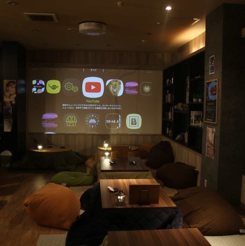 大画面のプロジェクターにてYouTubeやNetflixの各種コンテンツの他、サプライズムービー等もお流し出来ます。さらに貸切時はマイク使用も可能です♪zoom等のアプリも繋げますので、遠方の職場の方ともリモートでお話なども出来ます。